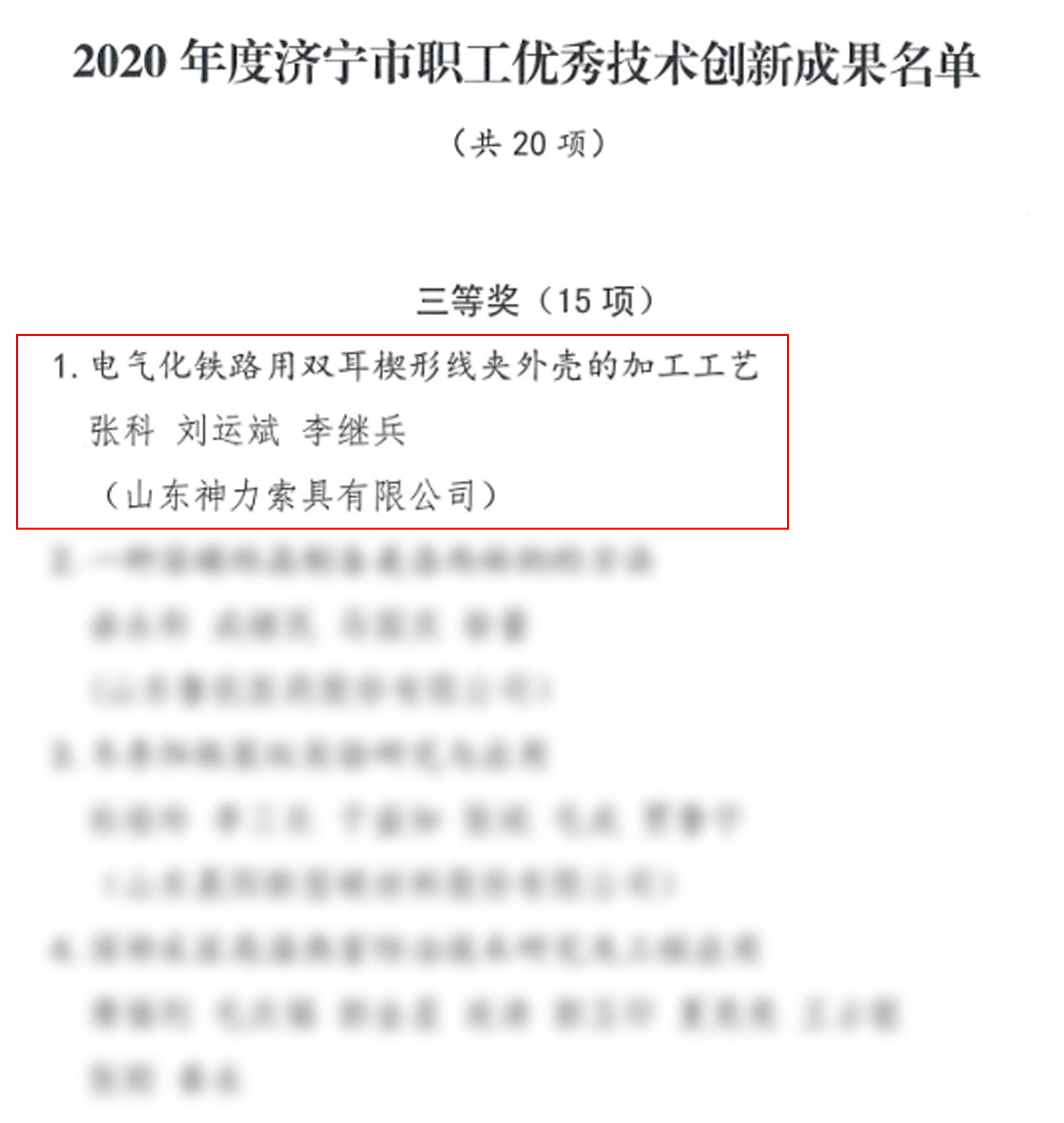 在濟(jì)寧市職工優(yōu)秀技術(shù)創(chuàng)新成果名單中,我公司創(chuàng)新成果“電氣化鐵路用雙耳鍥型線夾外殼的加工工藝”榮膺三等獎(jiǎng)。為積極踐行新發(fā)展理念,弘揚(yáng)勞模精神、勞動精神、工匠精神,市總工會對創(chuàng)新小組主要成員張科、劉云斌、李繼兵各獎(jiǎng)勵(lì)1000元。