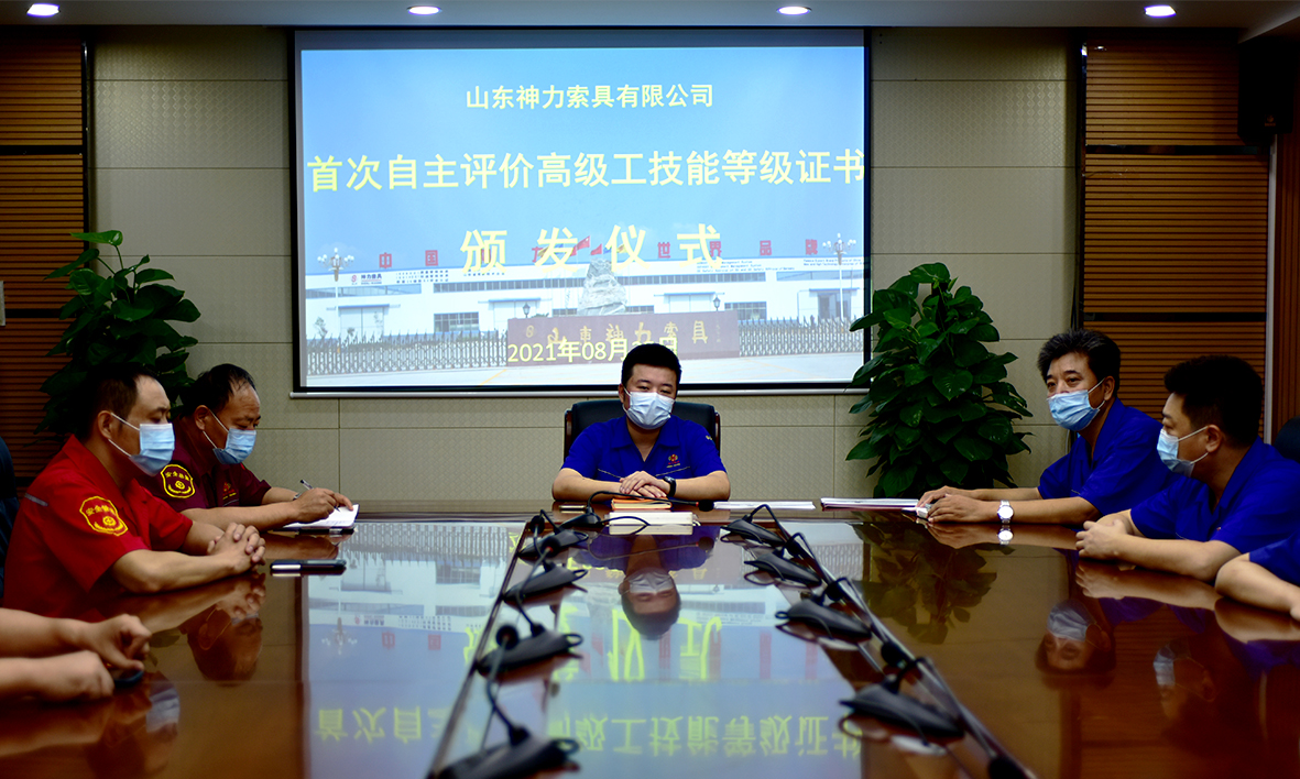 8月25日上午,山東神力索具有限公司首次企業(yè)自主評(píng)價(jià)高級(jí)工、中級(jí)工職工技能等級(jí)認(rèn)定證書(shū)頒證儀式在公司會(huì)議室舉行。公司總經(jīng)理杜大平、常務(wù)副總楊永海、工會(huì)主席李廣德、董事會(huì)秘書(shū)俞同磊、總經(jīng)理助理馬兆申、人資部部長(zhǎng)單春雪和相關(guān)分廠廠長(zhǎng)、市助企攀登干部馮超等領(lǐng)導(dǎo)參加了本次證書(shū)頒發(fā)儀式。儀式由黨支部副書(shū)記、工會(huì)主席李廣德負(fù)責(zé)主持 。