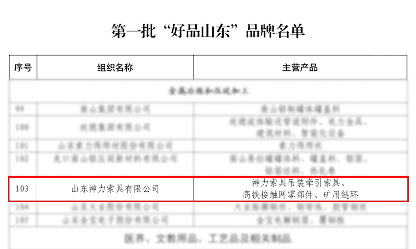 3月2日,“好品山東”建設(shè)新聞發(fā)布會(huì)在濟(jì)南舉行,公布第一批223家“好品山東”品牌。主營吊裝牽引索具、高鐵接觸網(wǎng)零部件、礦用鏈環(huán)的神力索具被評(píng)為首批“好品山東”品牌。